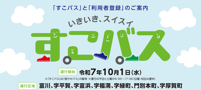 この度本運行に向け運行時間や料金などの見直しを行い、「公共交通利用の促進」と「健康づくり」と「地域経済の消費」を結びつけた、地域住民が利用しやすい交通環境である「AIデマンド交通のすこバス」を本日、令和7年10月1日から本格運行を開始する運びとなりました。