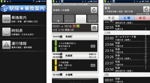 今回のAndroid版アプリケーションでは、「乗換案内サービス」「時刻表サービス」および「運行情報サービス」をご提供いたします。モバイル版「駅探★乗換案内」で高くご評価いただいている画面の見やすさ、情報の正確さ、使い勝手の良さを、Android版アプリケーションでもそのまま体感することができます。