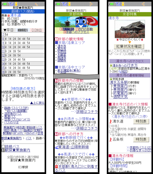 ※「京都市バス時刻表」および「京都特集」はiモード、EZweb、Yahoo!ケータイの各サービスでご提供します。
