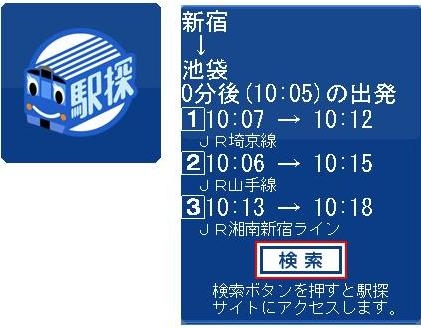 「検索」ボタンを押すだけで、設定経路を保有したまま駅探iモード公式サイト(無料)にアクセスし、より詳しい経路を確認することができます。