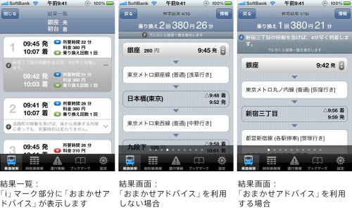 今回のVersion 4では、おすすめの行き方を表示する「おまかせアドバイス」機能を実装したほか、「途中駅表示」に停車時刻の表示を追加し、さらに実用的にご利用いただけるようになりました。また、お客様のご要望にお応えして、時刻表当駅始発の表示や、乗り換え案内のユーザインタフェイスの改良を行いました。