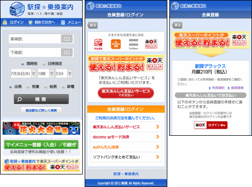 乗り換え案内/時刻表/地図を中心とした行動支援サービス(ナビゲーションサービス)を提供している株式会社駅探(所在地:東京都中央区、代表取締役社長:中村太郎、以下「当社」)は、2012年7月31日より、スマートフォンサイト「駅探★乗換案内」において「楽天あんしん支払いサービス」への対応を開始しました。