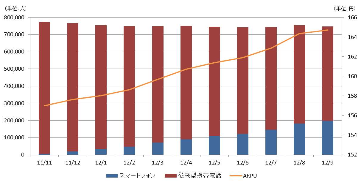 従来型携帯電話からスマートフォンへの移行に伴い、積極的に広告販促費を投入したことにより、スマートフォンにおける有料会員数は予定通りに推移しており、その結果、従来型携帯電話における有料会員数は減少傾向が続いておりますが、全体の有料会員数は横這い基調を維持しております。また、スマートフォンの有料会員の増加に伴い、DX会員の構成比が増加しており、有料会員1人当たり単価(以下「ARPU」という)は向上しております。