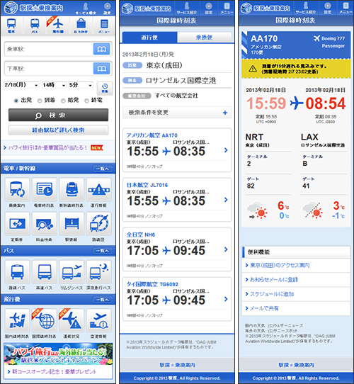 当社では、2011年11月18日にスマートフォンサイト「駅探★乗換案内」をリリース。さまざまな便利な機能で電車やバスの移動をご案内する「駅探デラックス」コースに加え、2013年2月18日には「駅探プライム」コースを開設し、世界中の飛行機の時刻表や運航状況を横断的に検索でき、海外の航空会社の運航状況も日本語で受け取ることができるサービスをリリースする等、スマートフォン向けサービスの強化に注力しております。