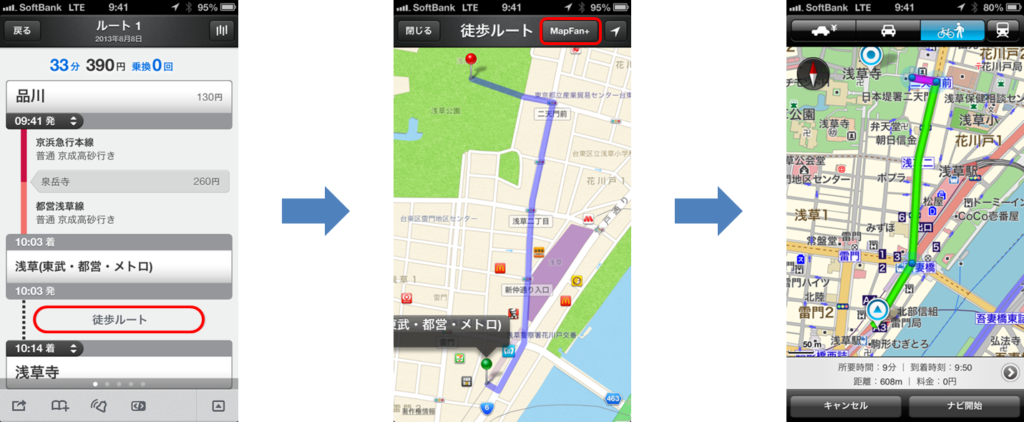 乗換案内検索結果におきまして、「徒歩ルート」が含まれる際、「徒歩ルート」の表示画面で「MapFan+」への連携ボタンを押すと、「MapFan+」のアプリが起動。車や徒歩等による詳細なルートの結果が表示されます。