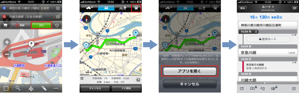 ルート検索時に、電車マークのボタンを押すと、「駅探★乗換案内」のアプリが起動。電車を利用した路線ルート検索結果が表示されます。