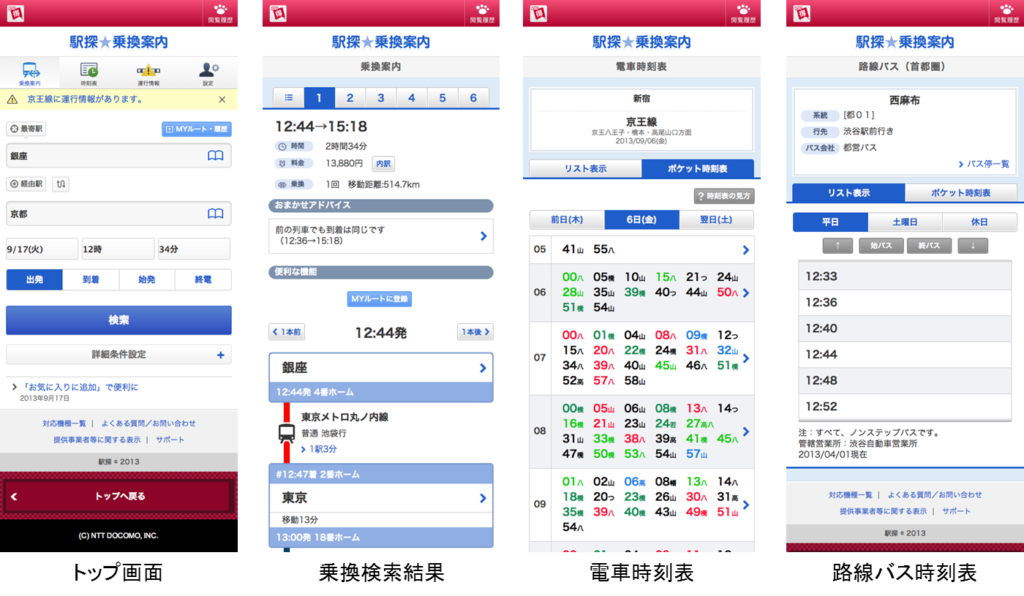 スマートフォンサイト「駅探★乗換案内」でおなじみの主要機能をサポートしています。