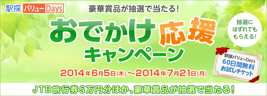 乗り換え案内/時刻表/地図を中心とした行動支援サービス(ナビゲーションサービス)を提供している株式会社 駅探(所在地:東京都港区、代表取締役社長:中村太郎、以下「当社」)は、映画館や遊園地、ホテルなど休日のお出かけをお得に楽しめる会員制の優待割引サービス「駅探バリューDays」のPCサイトオープンを記念して、旅行券5万円分など豪華賞品が抽選で当たる「おでかけ応援キャンペーン」を実施いたします。さらに、抽選ではずれても、応募特典として「駅探バリューDays」60日間無料お試しチケットをプレゼントいたします。