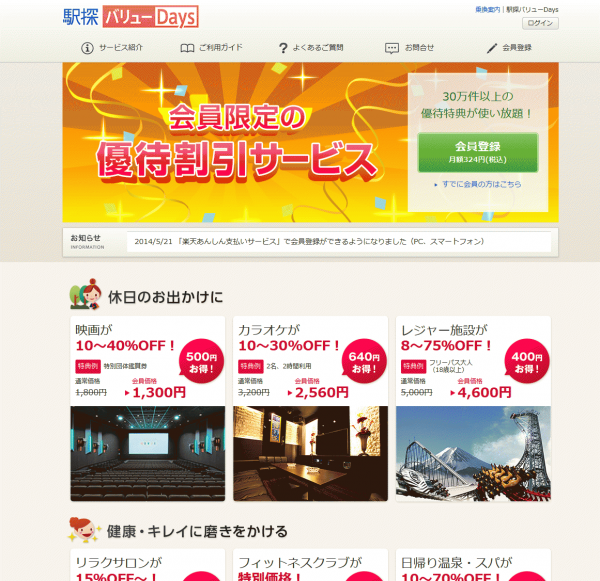 映画・カラオケ・旅行・宿泊・遊園地・フィットネスなど、約30万件以上のお店・施設が割引料金で利用できる会員制の優待割引サービスです。