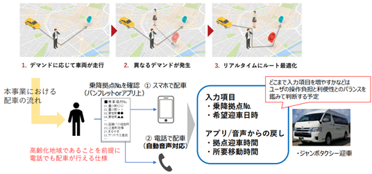 タクシー(デマンド交通)と路線バス(乗合交通)の長所を掛け合わせた、AIによるリアルタイムな便乗配車計算を行うサービス