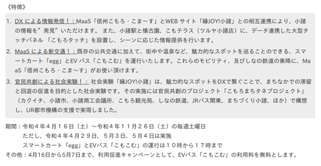 社会実験「縁JOY!小諸」では、DX(デジタルトランスフォーメーション:情報通信技術の活用による効果の最適化)とMaaS(モビリティ アズ ア サービス:複数の異なる交通を一連のサービスとして提供する仕組み)の組み合わせにより、小諸のまちなかでの滞留と回遊の促進を目的とした官民共創による社会実験を実施されます。小諸駅を中心とした小諸市中心拠点の求心力を向上するため、情報通信技術を導入し、しなの鉄道等の公共交通や店舗等の情報認知の拡大により、まちなかにおける市民や観光客の回遊が促進されることを目的としています。