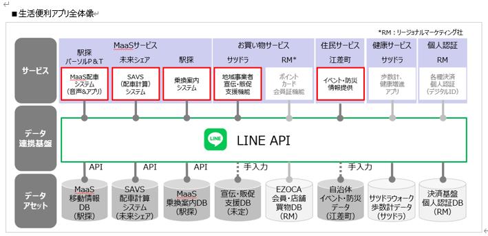 本実証実験でMaaS配車機能を中心に商店の情報提供・クーポン発券等「買い物」支援サービスを実装します(下記「サービス」赤枠の機能)。将来的には今回構築するLINE APIを活用したデータ連携基盤と同一の基盤にてポイントカード/個人認証(デジタルID)連携、デジタル地域振興券等地域通貨機能、マイナンバー等行政サービスとの連携も視野に入れ地域住民の生活全般をサポートする「生活便利アプリ」の構築も本事業を通じて目指していきます。
